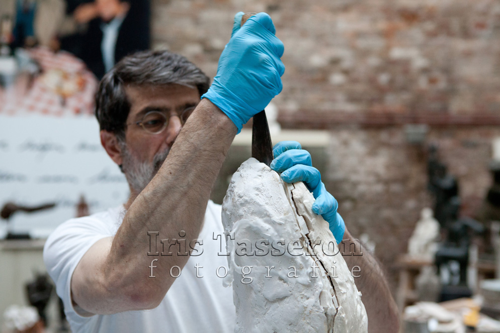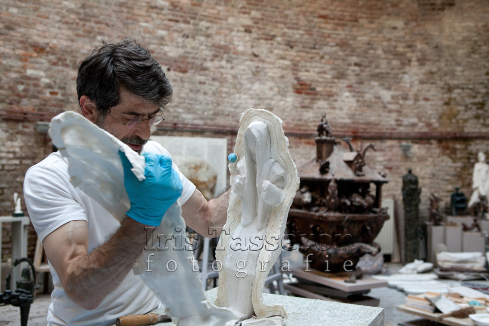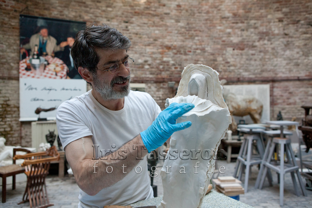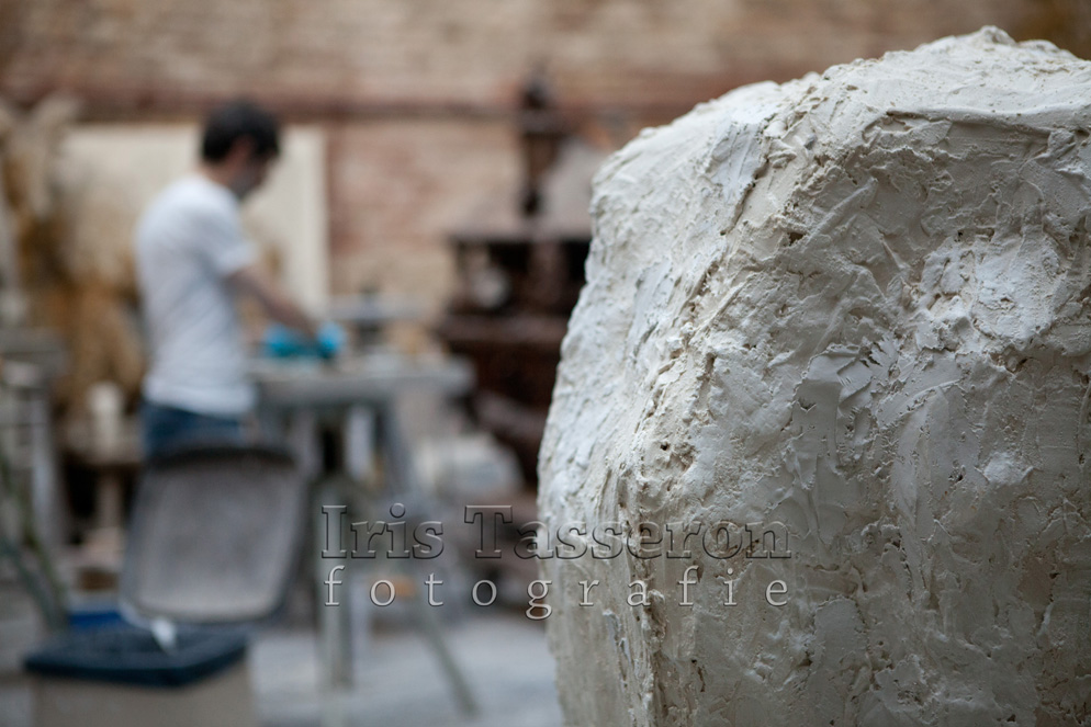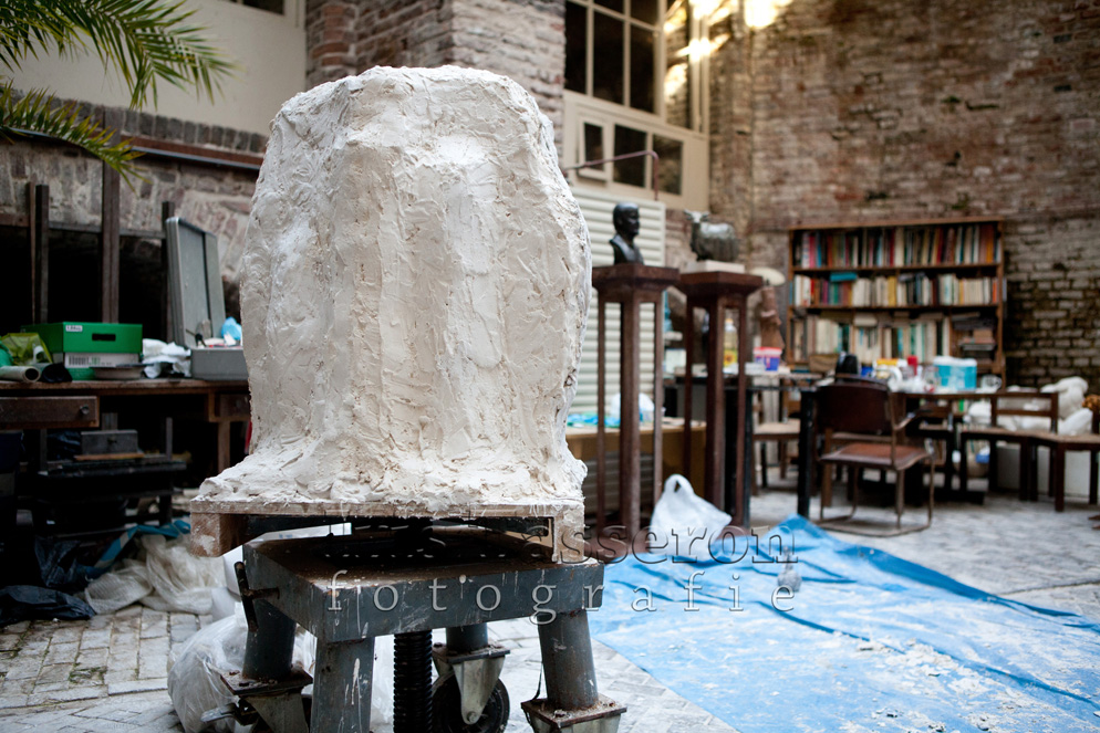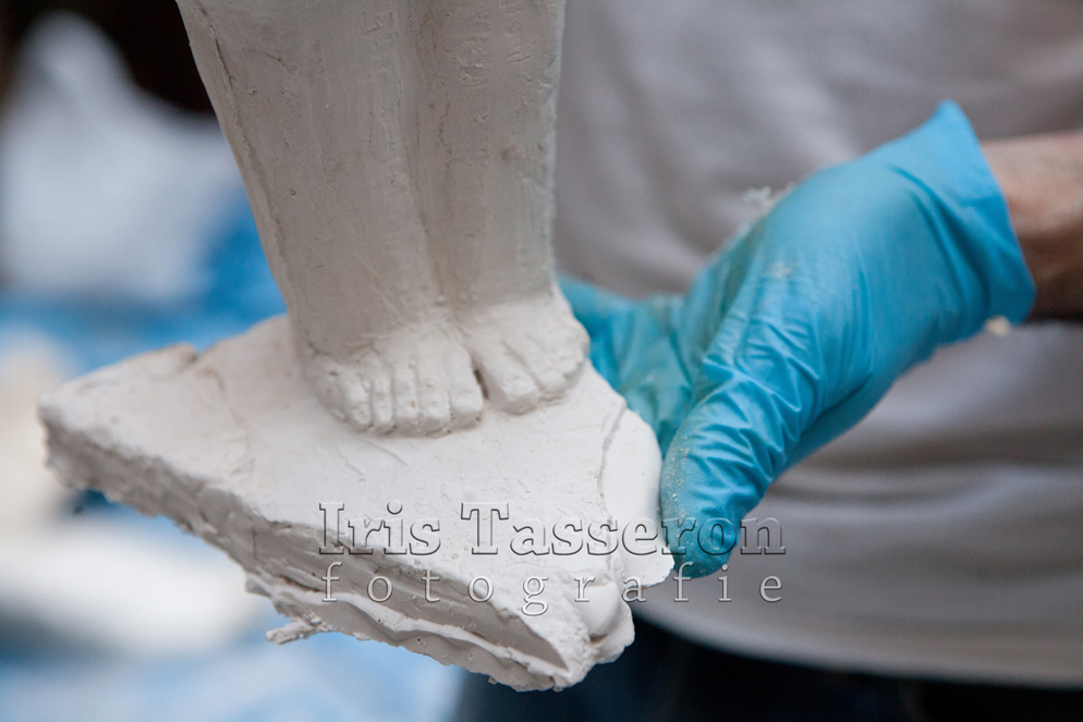 De voorbereiding voor het gieten van de sokkel is in volle gang. Amiran is klaar met het maken van de basis van de sokkel in klei, heeft het inmiddels ook in gips gezet om een mal te maken van rubber. Die mal wordt vervolgens opnieuw bewerkt en pas dan kan het bronzen kunstwerk worden gegoten. Zondag 24 augustus heeft Amiran een onderdeel van het beeld uit het gips gehaald. Heel voorzichtig, zodat het gips niet afbrokkelt.
