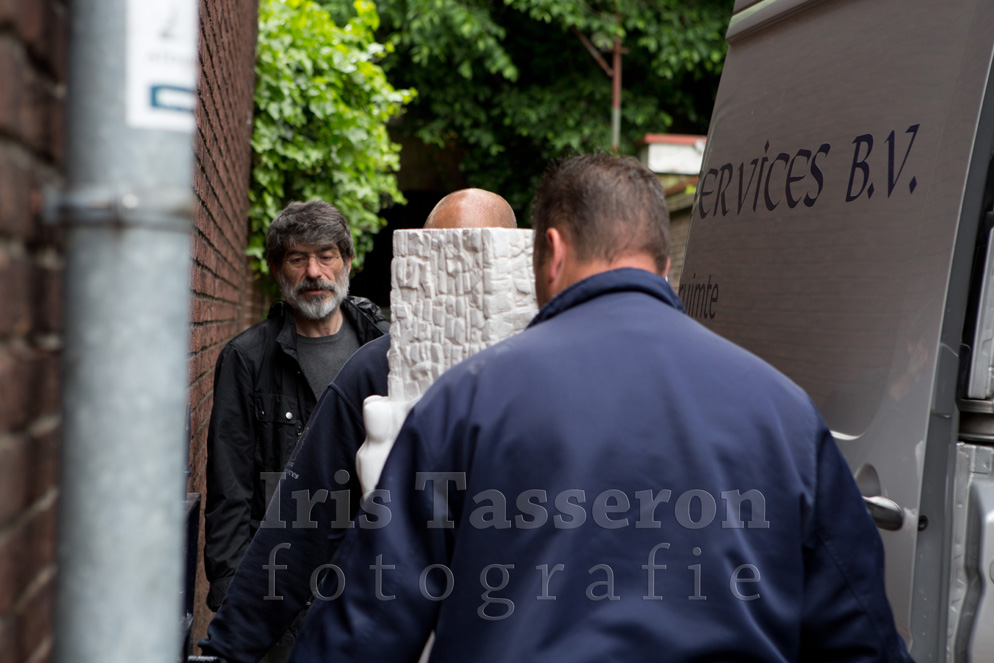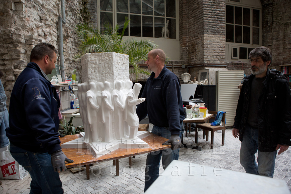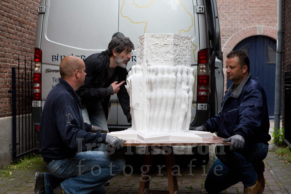 Vandaag het vertrek van de sokkel. Bronsgieter Binder komt het ophalen, zodat het in brons gegoten kan worden. Kunstenaar Amiran Djanashvili haalt met een föhn de laatste stofrestjes weg en dan kan het weggedragen worden. Gips is kwetsbaar materiaal, maar het gaat goed. De sokkel is heel aangekomen bij de bronsgieter.