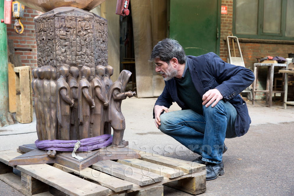 Het beeld is in brons gegoten. Voor het eerst ziet Amiran Djanashvili het resultaat. Het beeld staat buiten en wordt zorgvuldig bekeken. En dan komt de laatste fase, het patineren. Dat bepaalt de kleur van het beeld, dat donderdag 29 oktober wordt onthuld voor het Spoorwegmuseum in Utrecht.