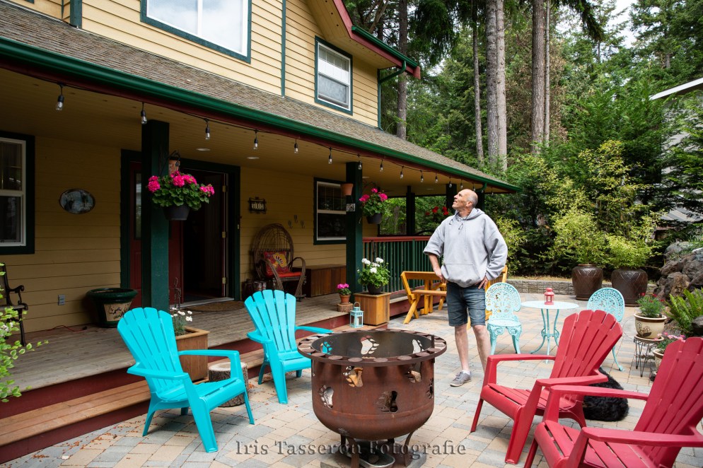 Terry woont mooi middenin het bos vlakbij Victoria. In zijn achtertuin ziet hij soms een zwarte beer voorbij sjokken. Ik woon in Utrecht ook tussen de bomen, maar beren zie ik niet, wel vogels, pissebedden, mieren, spinnen, toeristen, honden en hun baasjes en zo nu en dan een alcoholist op een bankje. Ik merk bij mijzelf dat ik een beetje jaloers ben. Het lijkt mij geweldig om zo’n huis te hebben als Terry.