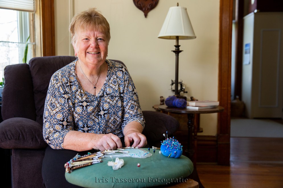 Als we het interview afronden wil Johanna mij nog één ding laten zien. Ze pakt wat wol en gaat weer zitten in haar stoel en dan gaat ze kantklossen. Dat vindt ze heerlijk om te doen. Hollandser kan het niet.