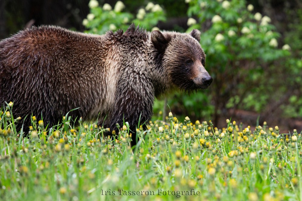 Het lukt om foto’s te maken. We houden de beer en ook de omgeving goed in de gaten, want ook in een auto ben je niet altijd veilig voor een beer. Zeker niet met het raam open. Maar jemig wat een mooi dier is het toch en hij ziet er zo onschuldig uit. Toch blijf ik bij de volgende wandeling lawaai maken, want lopend wil ik de grizzly niet ontmoeten.