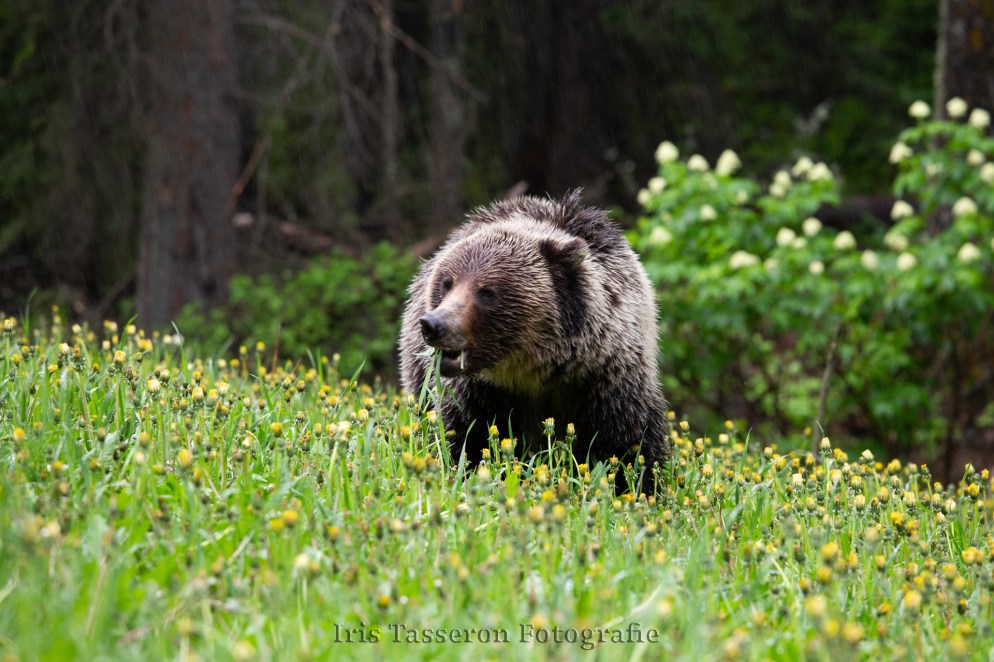 Het lukt om foto’s te maken. We houden de beer en ook de omgeving goed in de gaten, want ook in een auto ben je niet altijd veilig voor een beer. Zeker niet met het raam open. Maar jemig wat een mooi dier is het toch en hij ziet er zo onschuldig uit. Toch blijf ik bij de volgende wandeling lawaai maken, want lopend wil ik de grizzly niet ontmoeten.