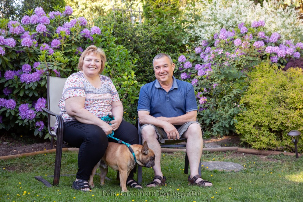 We gaan in de tuin zitten achter het huis. De zon schijnt tenslotte. Achter in de tuin merk je niets van de grote stad waar ze wonen. Het lijkt alsof we aan de rand van het bos zitten.