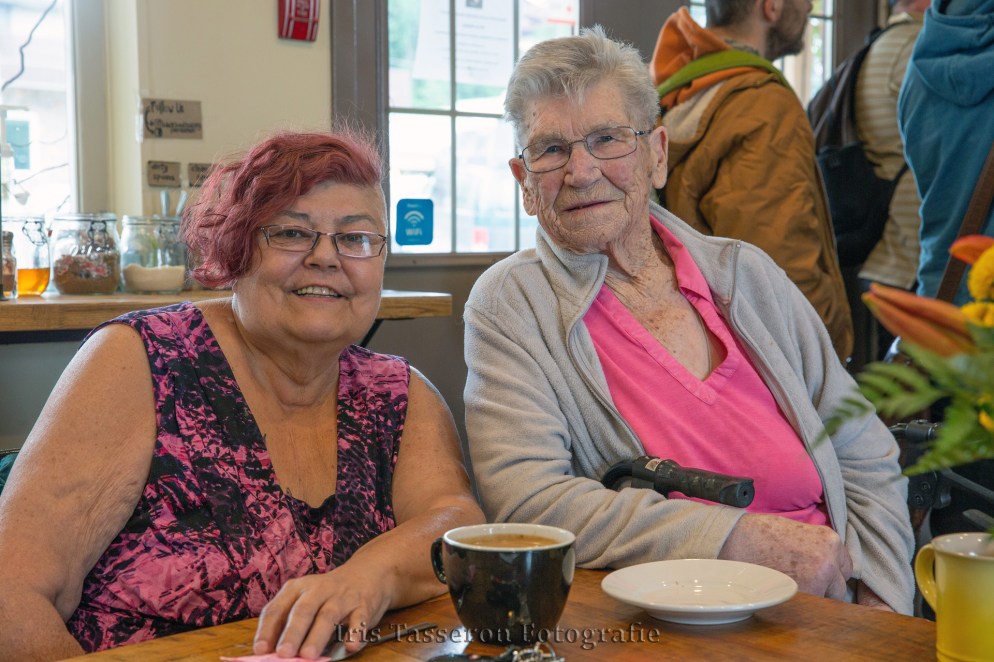 Vanuit mijn ooghoek zie ik twee dames binnenkomen. 1 van hen heeft een rollater en schuift aan vlak bij ons. De ander roept dat de sandwiches op zijn helaas, ze moeten het met een cookie doen.