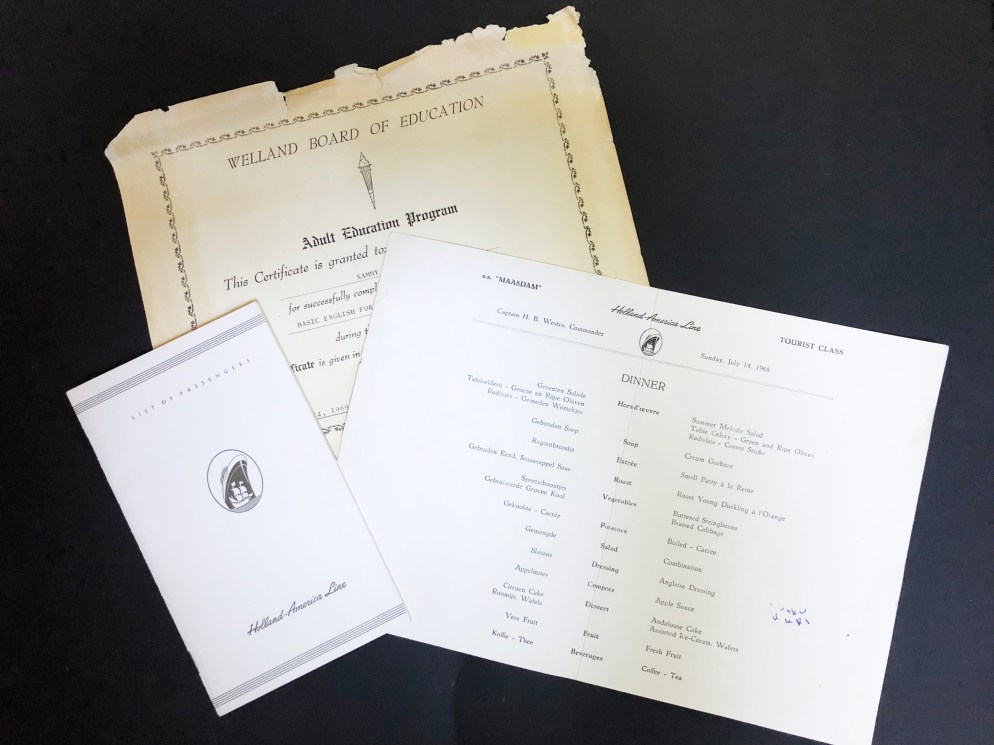 De belangrijkste papieren liggen klaar voor de reis, zoals de passagierslijst van de SS Maasdam van 6 juli 1968. Tussen de papieren bij mijn moeder vond ik ook nog een menukaart van 14 juli 1968 van de boot. Ze vertelde mij dat het luxueus was op de boot. Op het menu heeft of mijn zus…